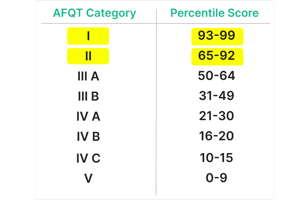 AFQT scores are divided into 8 categories, shown in the ASVAB score chart below: